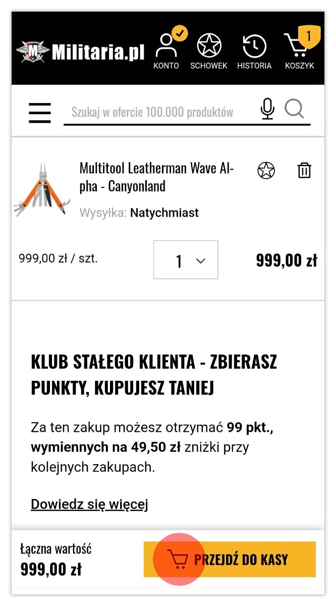 - Przejdź do koszyka Kliknij ikonę koszyka, a następnie przycisk PRZEJDŹ DO KASY.
