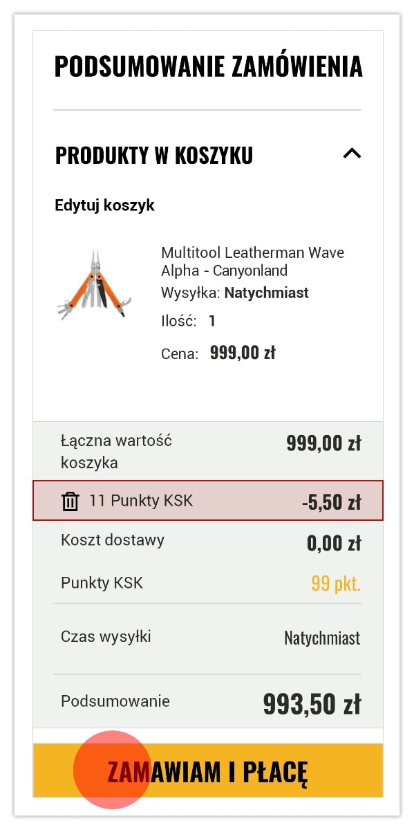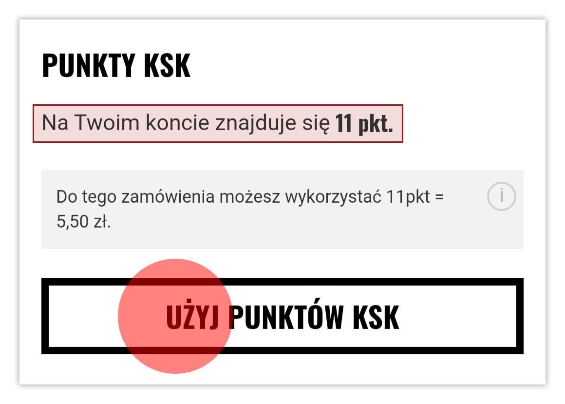 - Aktywuj punkty KSK Aby obniżyć wartość zamówienia, kliknij przycisk UŻYJ PUNKTÓW KSK. Po kliknięciu strona automatycznie się odświeży.