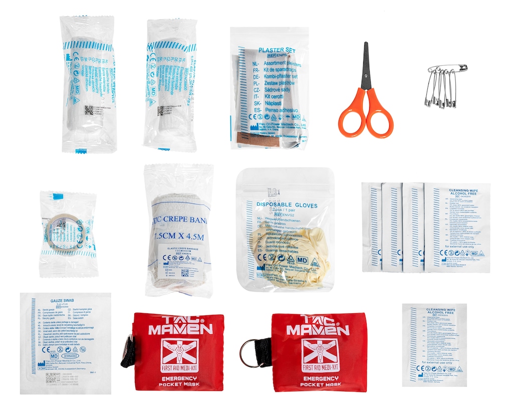 Apteczka zawiera podstawowe wyposażenie, na które składają się:
