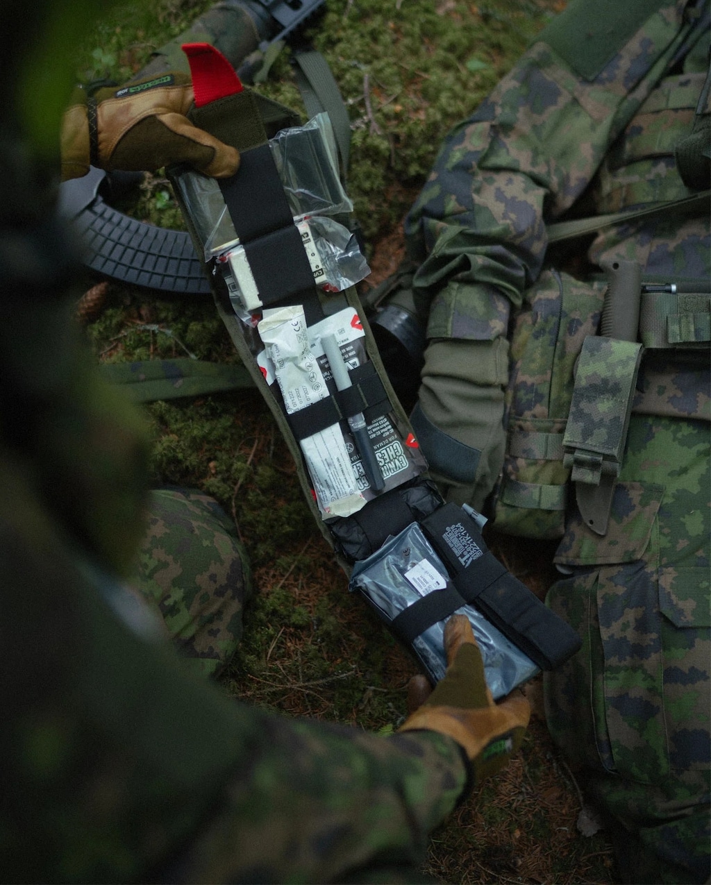 Apteczkę wykonano z Cordury 500D, czyli materiału o wysokiej odporności na ścieranie, rozdarcia i intensywne użytkowanie w terenie. Tkanina ta cechuje się dobrą trwałością przy zachowaniu stosunkowo niskiej wagi, co ma znaczenie w oporządzeniu taktycznym. Materiał dobrze znosi trudne warunki atmosferyczne oraz kontakt z wilgocią, co zwiększa jego funkcjonalność w zastosowaniach outdoorowych i bojowych. Zastosowany materiał spełnia wymagania NIR (Near Infrared), co oznacza ograniczoną widoczność w zakresie podczerwieni.