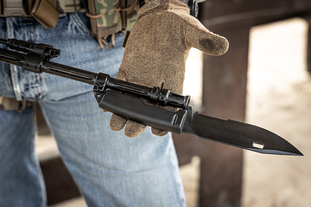 Okładzina rękojeści została wykonana metodą natryskową z poliamidu wzmacnianego włóknem szklanym, co zwiększa trwałość całej konstrukcji. Zsunięciu dłoni na ostrze zapobiega odpowiednio ukształtowany chwyt oraz stalowy jelec, pełniący jednocześnie funkcję punktu montażowego do urządzenia wylotowego lufy karabinka.