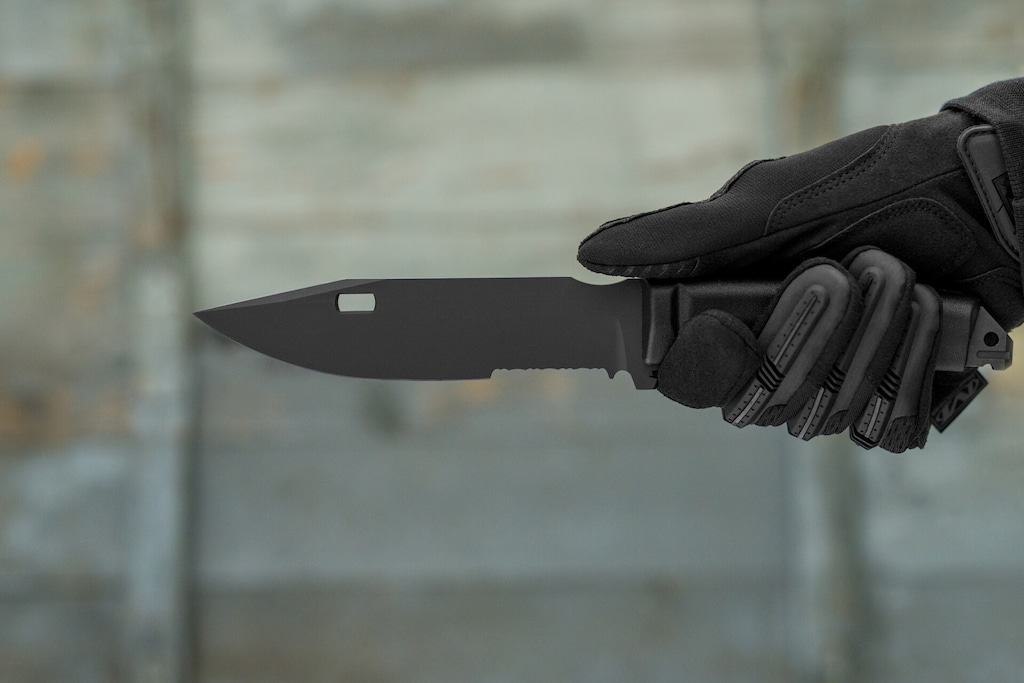 Częściowo ząbkowaną głownię typu Drop-Point wykonano ze stali narzędziowej NCV1 charakteryzującej się dobrą odpornością na stępienie. Całą powierzchnię klingi pokryto czarną powłoką antyodblaskową, która dodatkowo chroni nóż przed korozją.