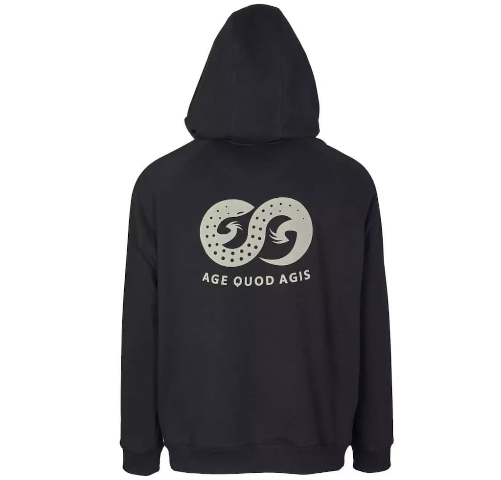 Model wyposażono w pojemną kieszeń typu kangurka, w której znajduje się zapinana na zamek YKK przegroda pozwalająca na bezpieczne przenoszenie niezbędnych drobiazgów. Ponadto w modelu zastosowano dodatkowe kieszenie na bokach na niewielkie przedmioty. Na froncie bluzy umieszczono duże logo producenta, a na plecach napis "Age Quod Agis".