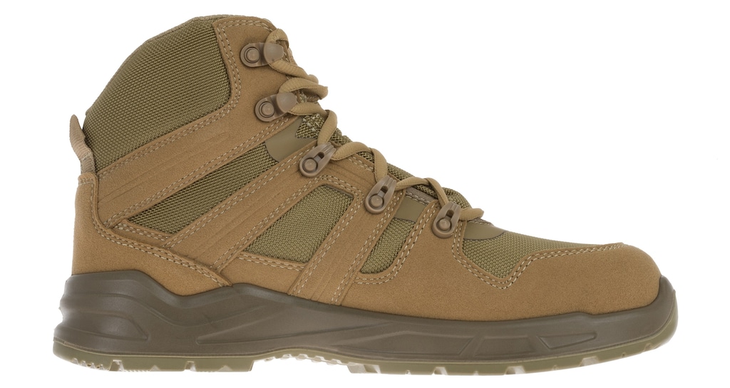 Wysokie buty taktyczne w kolorze piaskowym, wykonane z mikrofibry łączonej z materiałem tekstylnym Oxford. Model spełnia normę EN ISO 20347:2022 O2 SR FO. Sprawdzą się zarówno podczas aktywności w terenie, jak i w codziennym użytkowaniu.