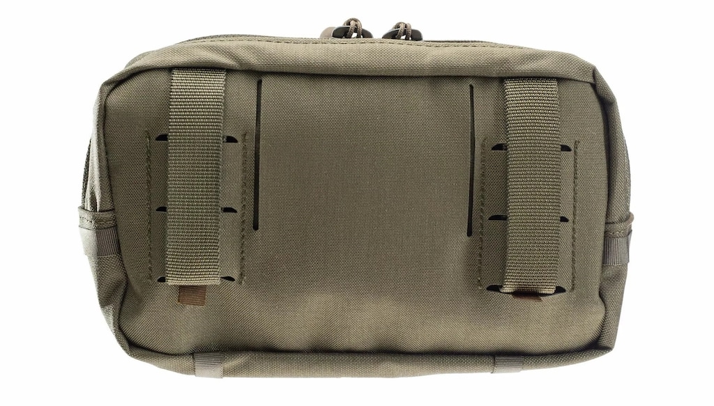 Przednia część kieszeni wyposażona jest w taśmy systemu MOLLE/PALS (20 mm) umożliwiające dodawanie modułów, organizerów lub dodatkowych akcesoriów. Model można również zamocować na pasie o maksymalnej szerokości 50 mm.