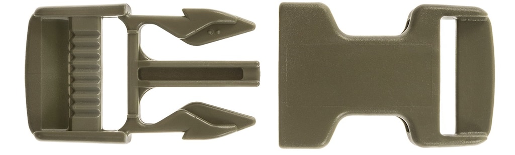 Zestaw pięciu klamer zatrzaskowych Duraflex w kolorze oliwkowym. Wykonane z wytrzymałego tworzywa acetalowego, cechującego się dużą sztywnością i odpornością na obciążenia oraz uderzenia. Klamry pasują do taśm o szerokości 20 mm i są pokryte powłoką IR, niewidoczną w podczerwieni.