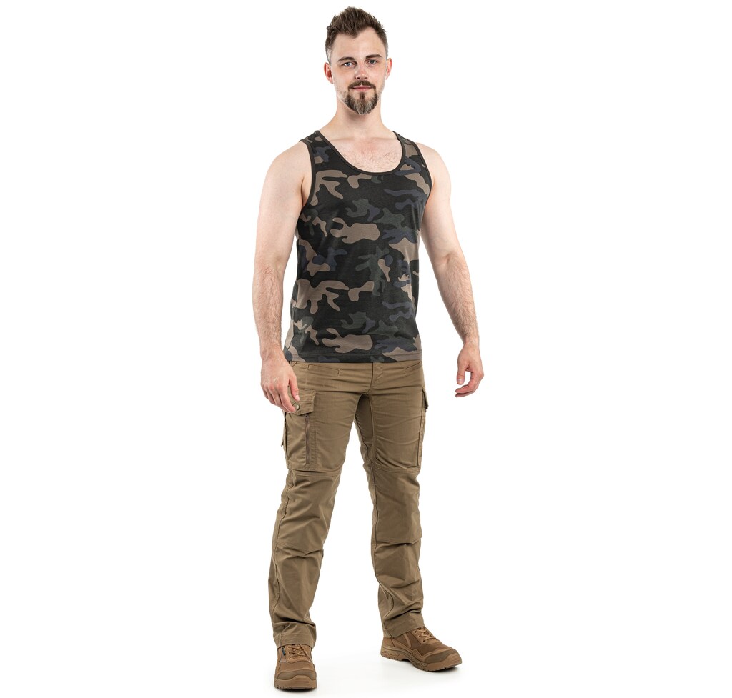 Klasyczny tank top w kamuflażu Dark Camo, wykonany w całości z naturalnej tkaniny bawełnianej o gramaturze 160 g/m2. Materiał przyjazny dla skóry, komfortowy w noszeniu przez cały dzień, z prostym cięciem, które zapewnia swobodę ruchów i uniwersalne zastosowanie.