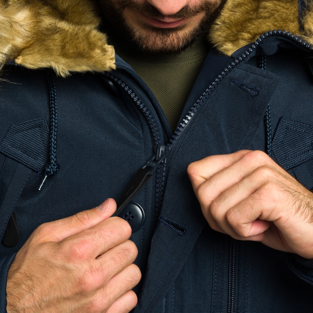 Kurtka zapinana jest na jednokierunkowy zamek błyskawiczny, który został zabezpieczony zapinaną na duże guziki klapą sztormową. Takie rozwiązanie zapewnia lepsze utrzymanie temperatury i chroni przed przenikaniem silnego wiatru. Klapa zapobiega również blokowaniu się zamka spowodowanego gromadzeniem się kurzu, a także zamarzaniu na nim wody czy zbrylaniu się śniegu.