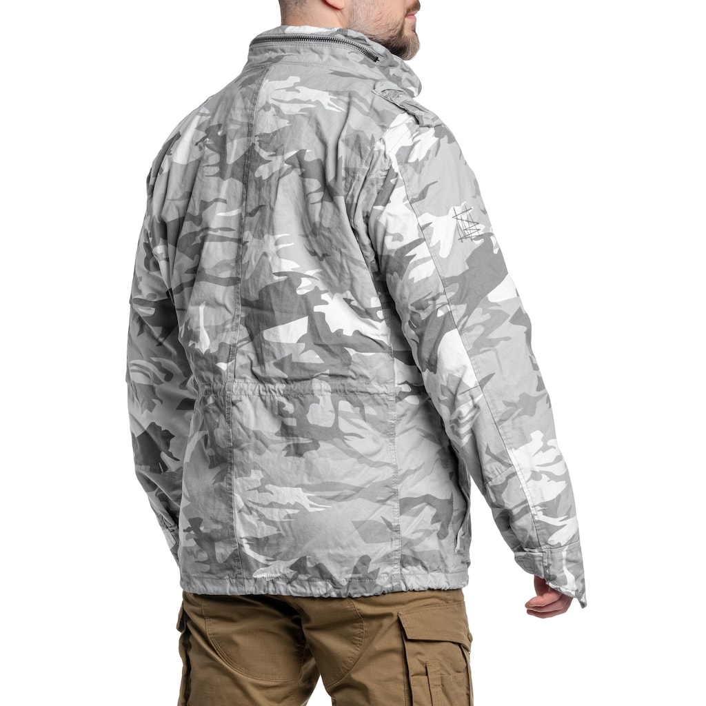 Całoroczna kurtka w kamuflażu Blizzard Camo inspirowana klasycznym modelem amerykańskiej kurtki M65, uwielbianej na całym świecie za swoją funkcjonalność i wytrzymałość. Wykonana została z połączenia poliestru i bawełny oraz wyposażona w odpinaną podpinkę ocieplającą, kaptur chowany w wysokim kołnierzu oraz 4 praktyczne kieszenie. Wierzchnia bawełniana warstwa została fabrycznie postarzona, dzięki czemu uzyskano efekt sprania w stylu vintage.