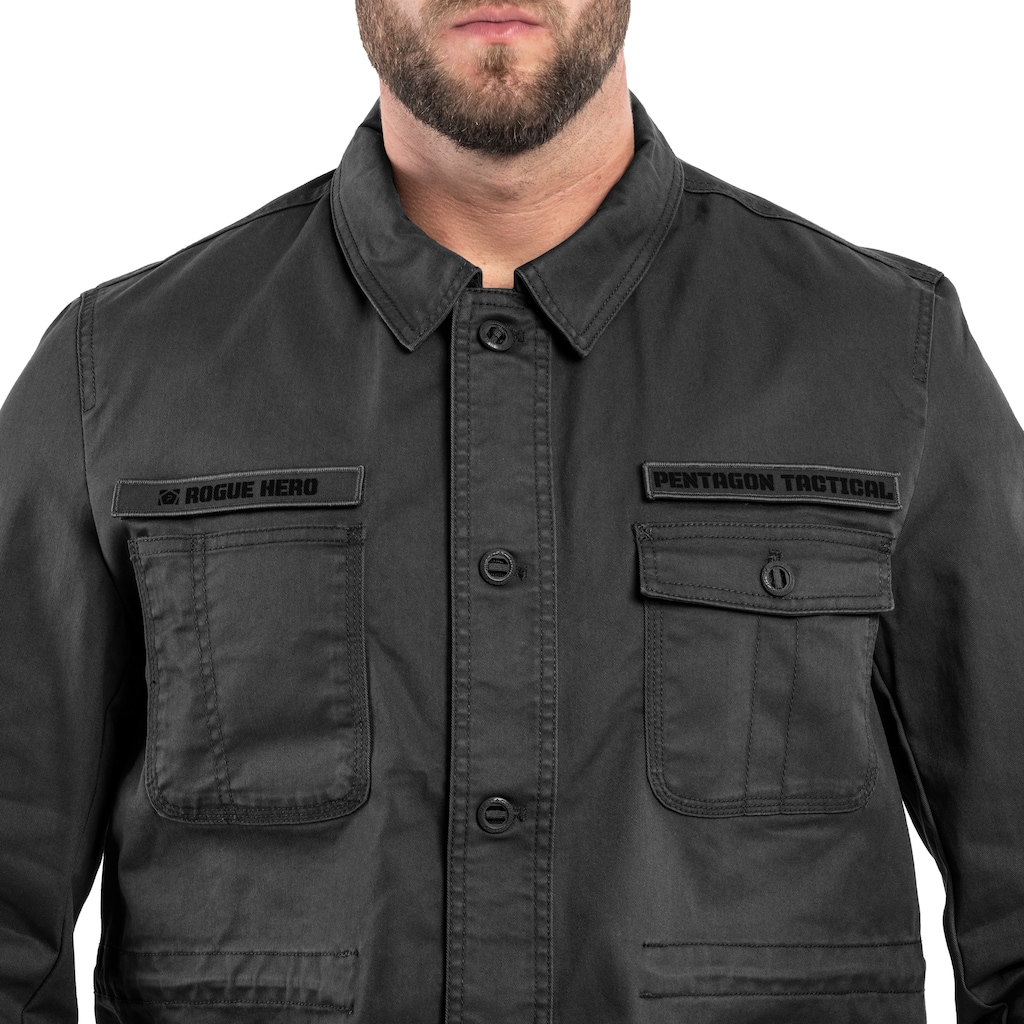 Kurtka polowa w kolorze czarnym zaprojektowana z myślą o zastosowaniach taktycznych i codziennym użytkowaniu. Uszyta z trwałej tkaniny twill, łączącej naturalną bawełnę (65%) z wytrzymałym poliestrem (35%). Model wyposażono w 5 kieszeni, które ułatwiają przechowywanie drobnych akcesoriów. Zawiera zapięcie na guziki w stylu kanadyjskim, regulowane mankiety oraz elastyczne sznurki do regulacji w talii, co poprawia dopasowanie i wygodę.