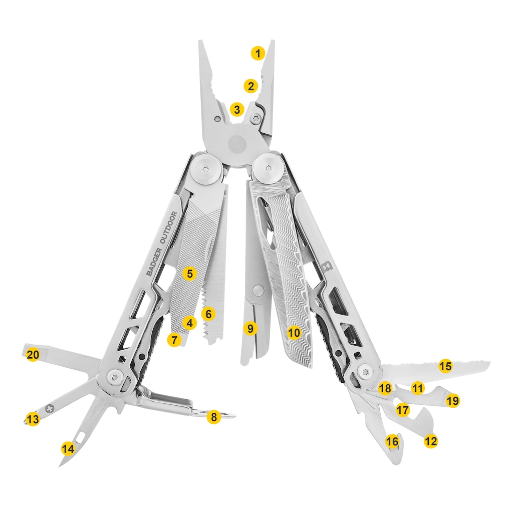 Multitool wyposażony w 20 praktycznych narzędzi w tym m.in.: kombinerki z wymiennym przecinakiem do drutu, nóż, piłę czy pilnik. Propozycja dla osób poszukujących modelu trwałego, poręcznego oraz z szeroką gamą funkcji, który sprawdzi się zarówno podczas codziennych prac i drobnych napraw, jak i w trakcie aktywności outdoorowych np. biwakowania w lesie.