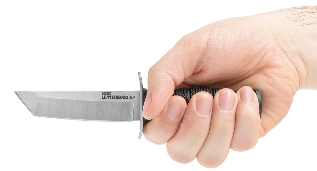 Kompaktowa wersja noża Cold Steel Leatherneck, inspirowanego klasycznymi nożami bojowymi US Marines. Model ze stałym ostrzem w konstrukcji Full Tang przeznaczony do zastosowań taktycznych i survivalowych. Głownię typu Tanto wykonano ze stali nierdzewnej 8Cr13MoV, która łączy odporność na korozję z łatwością ponownego ostrzenia. Krawędź tnącą wyprowadzono szlifem płaskim (Flat Grind) i wykończono metodą satynowania. W komplecie znajduje się kabura w systemie Secure-Ex z otworami i przelotkami do wielopozycyjnego mocowania na pasie lub elementach ekwipunku.