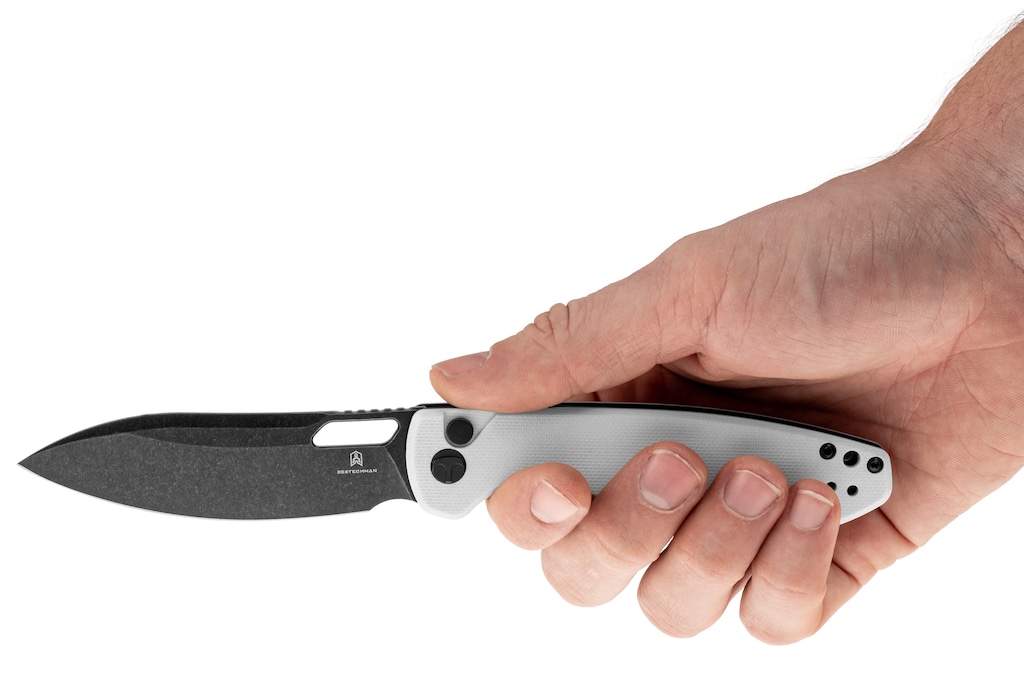 Okładziny rękojeści wykonano z laminatu G10 w kolorze białym. Zastosowane tworzywo cechuje się niską wagą przy jednoczesnym zachowaniu wysokiej odporności na uszkodzenia, wilgoć, zmianę temperatur, a także większość rozpuszczalników i kwasów. Ergonomiczny kształt okładzin w połączeniu z ich teksturowaną powierzchnią zapewnia pewny oraz bezpieczny chwyt.