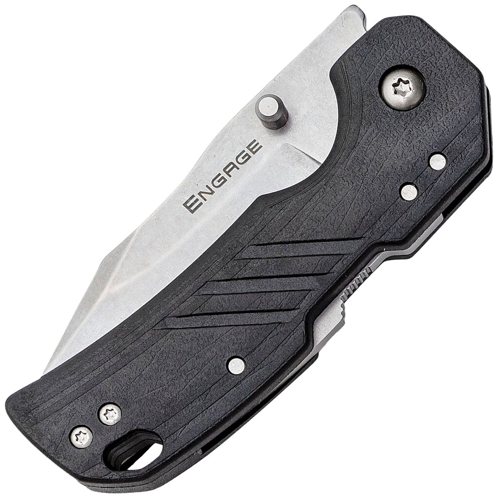 Składany nóż EDC (Every Day Carry) z serii Engage, wyposażony w głownię o profilu Clip-Point wykonaną ze stali nierdzewnej 4116SS charakteryzującej się łatwością ostrzenia. Ostrze wykończono techniką Stonewash, zwiększając odporność na zarysowania oraz niwelując refleksy świetlne. Nóż otwierany jest za pomocą obustronnego kołka pod kciuk. Głownia blokowana jest przesuwnym mechanizmem Atlas Lock opatentowanym przez Cold Steel. Rękojeść w kolorze czarnym wykonana z nylonu wzmocnionego włóknem szklanym (GFN) zapewnia antypoślizgowy chwyt. Wygodne, codzienne przenoszenie zapewnia sprężysty klips.