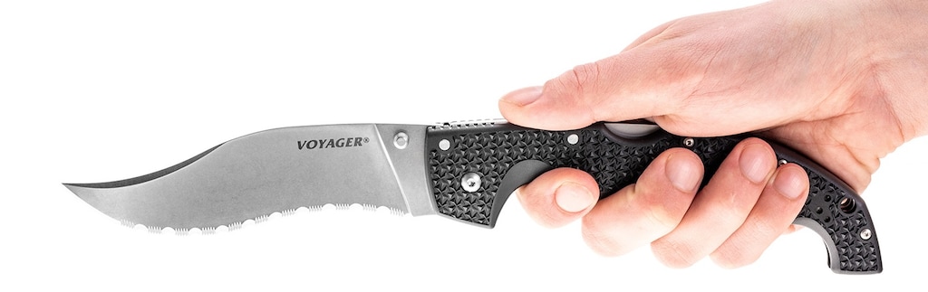 Jeden z klasyków Cold Steel, ulubiony nóż założyciela tej firmy. Wielu fanów noży powie, że to Espada XL jest królową wszystkich noży ColdSteel, ale wg mnie ten konkretny model voyagera stanowi godnego zawodnika do tego tytułu. Wygląd "na żywo" absolutnie zabójczy- raczej nie do pokazywania przy ludziach nieoswojonych z widokiem noża w przestrzeni publicznej. Kształt ostrza i ząbkowanie tworzy świetne połączenie gdy szukamy noża do cięcia miękkich materiałów i tkanin. Należy mieć na uwadze to, że czubek ostrza schodzi się do niemal igły, co w połączeniu z zębatym ostrzem ogranicza użyteczność noża w "bushcrafcie" lub pracach technicznych(ryzyko odłamania tych małych struktur przy kontakcie z drewnem lub innym podobnie twardymi materiałami). Minusem jest wykończenie/szlifowanie głównego elementu blokady TriAdLock, w miejscu kontaktu z ostrzem są "pasiaste" ślady po obróbce metalu które powodują słyszalne i wyczuwalne tarcie blokady o ostrze- trzeba samemu sobie to papierem ściernym doszlifować, żeby chodziło płynnie.