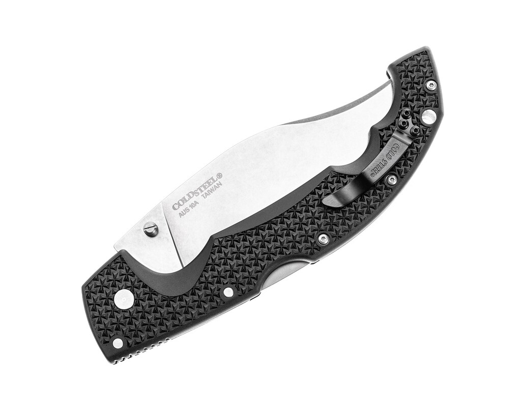 Największe składane tanto w ofercie Cold Steel. Ma wydatną gardę, karbowanie na rękojeści dla lepszego oparcia kciuka i aluminiowe przekładki. Konstrukcja jest tak solidna, że musi się dotrzeć do gładkiego działania, super!