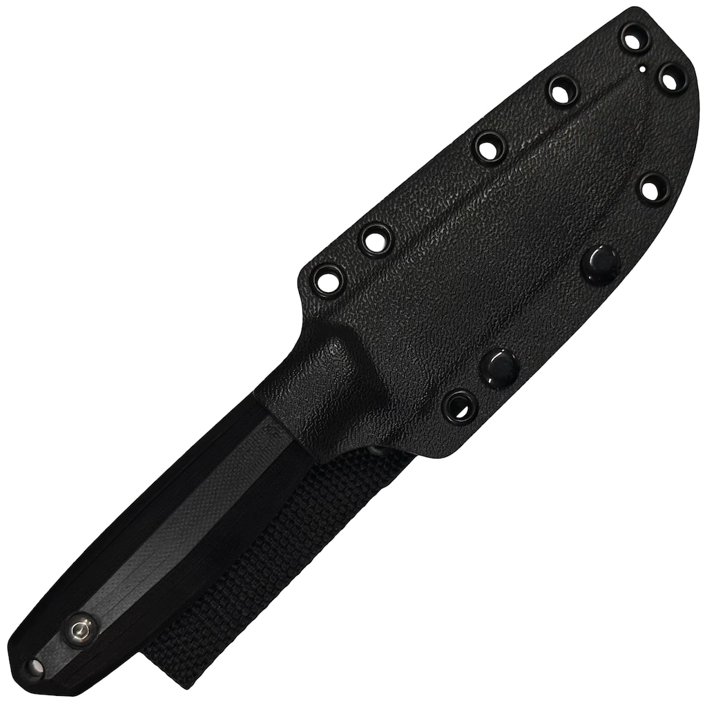 Rękojeść wykonano z czarnego laminatu G10, który zapewnia wytrzymałość oraz pewny chwyt dzięki antypoślizgowej fakturze. W komplecie znajduje się solidna pochwa z kydexu wyposażona w otwory montażowe, które umożliwiają wygodne przypięcie m. in. do paska lub plecaka.