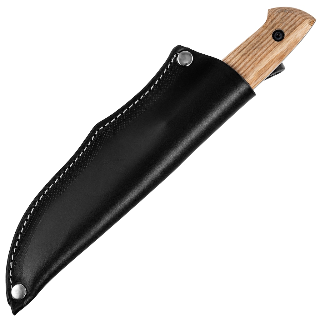 Ostrze zostało wykończone szlifem płaskim, który sprawdzi się podczas krojenia, strugania lub rąbania drewna. Znajdujący się na początku ostrza jelec zapobiega zsunięciu się dłoni podczas pracy.