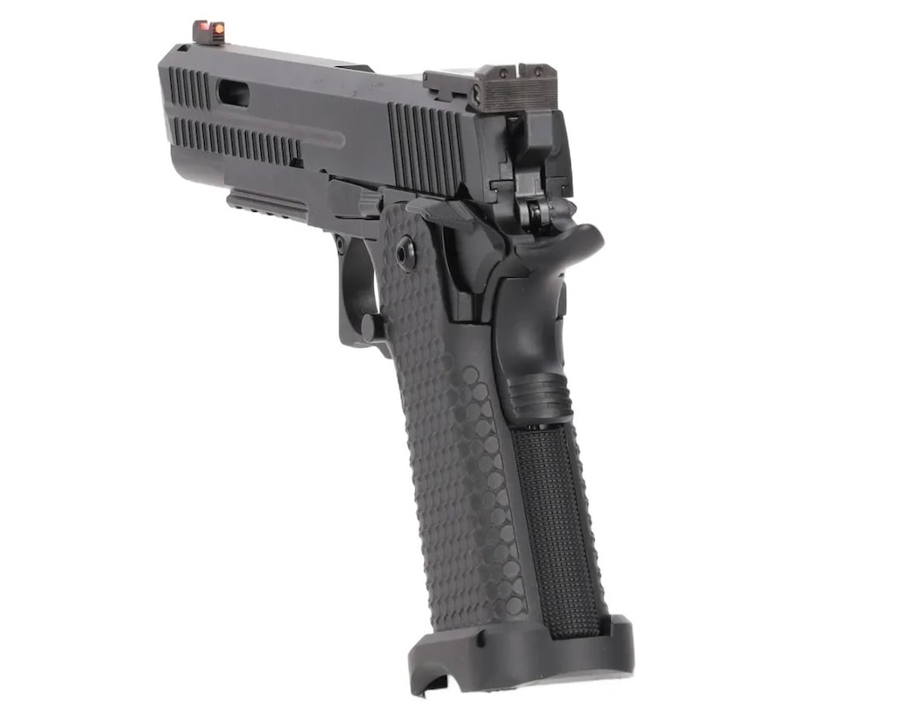 Pistolet wyposażono w światłowodową muszkę oraz szczerbinkę z regulacją w pionie i poziomie, co umożliwia jej dopasowanie do indywidualnych preferencji i warunków strzelania. Ergonomiczna rękojeść z antypoślizgową fakturą zapewnia pewny oraz stabilny chwyt.