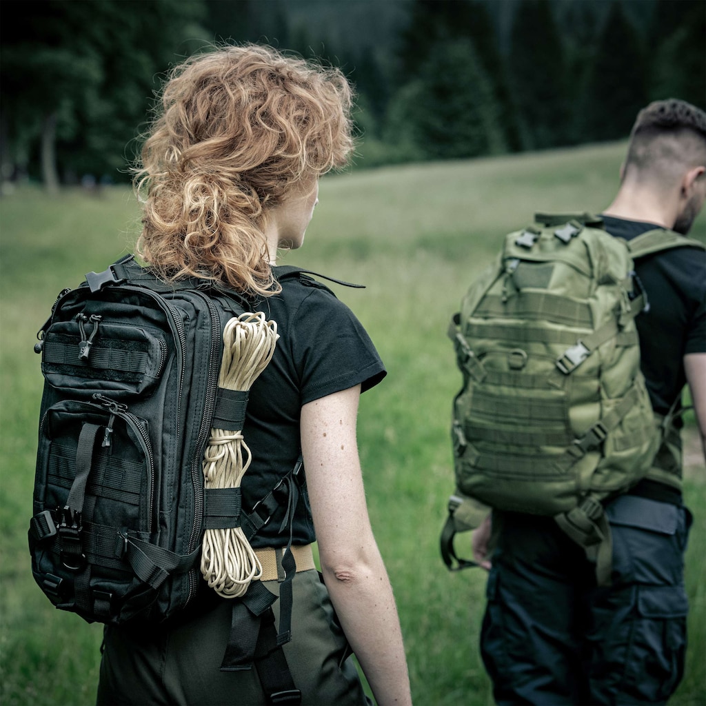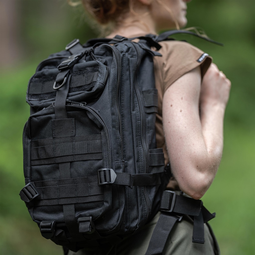 Działania taktyczne: Dzięki rozwiązaniom takim jak D-ringi czy system troczenia MOLLE, plecak umożliwia dołączanie dodatkowego wyposażenia, jak kieszenie taktyczne czy apteczka.