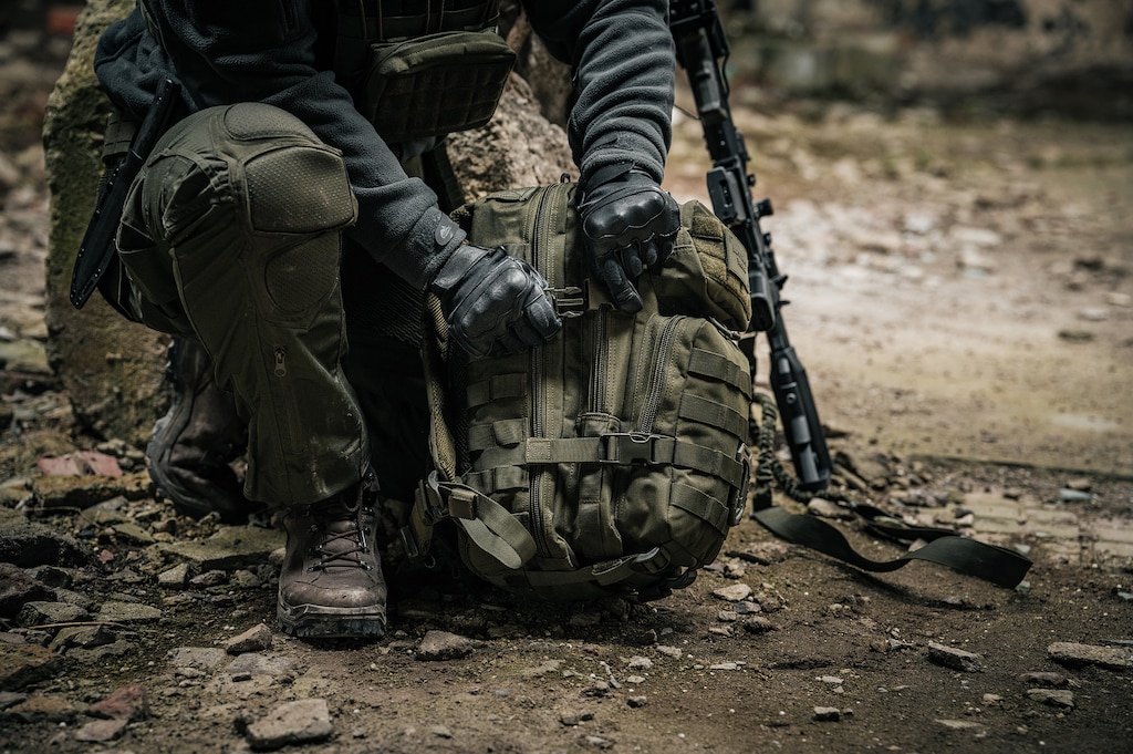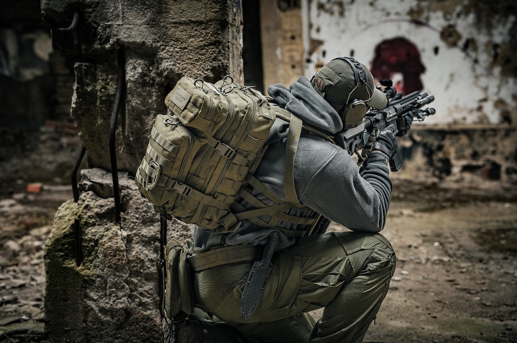 Działania taktyczne: Plecak może stanowić element wyposażenia wykorzystywanego podczas działań w terenie. Kompatybilność z systemem MOLLE/PALS oraz możliwość rozbudowy o dodatkowe moduły pozwalają dostosować konfigurację do charakteru wykonywanego zadania. Panel velcro umożliwia montaż naszywek lub emblematów.