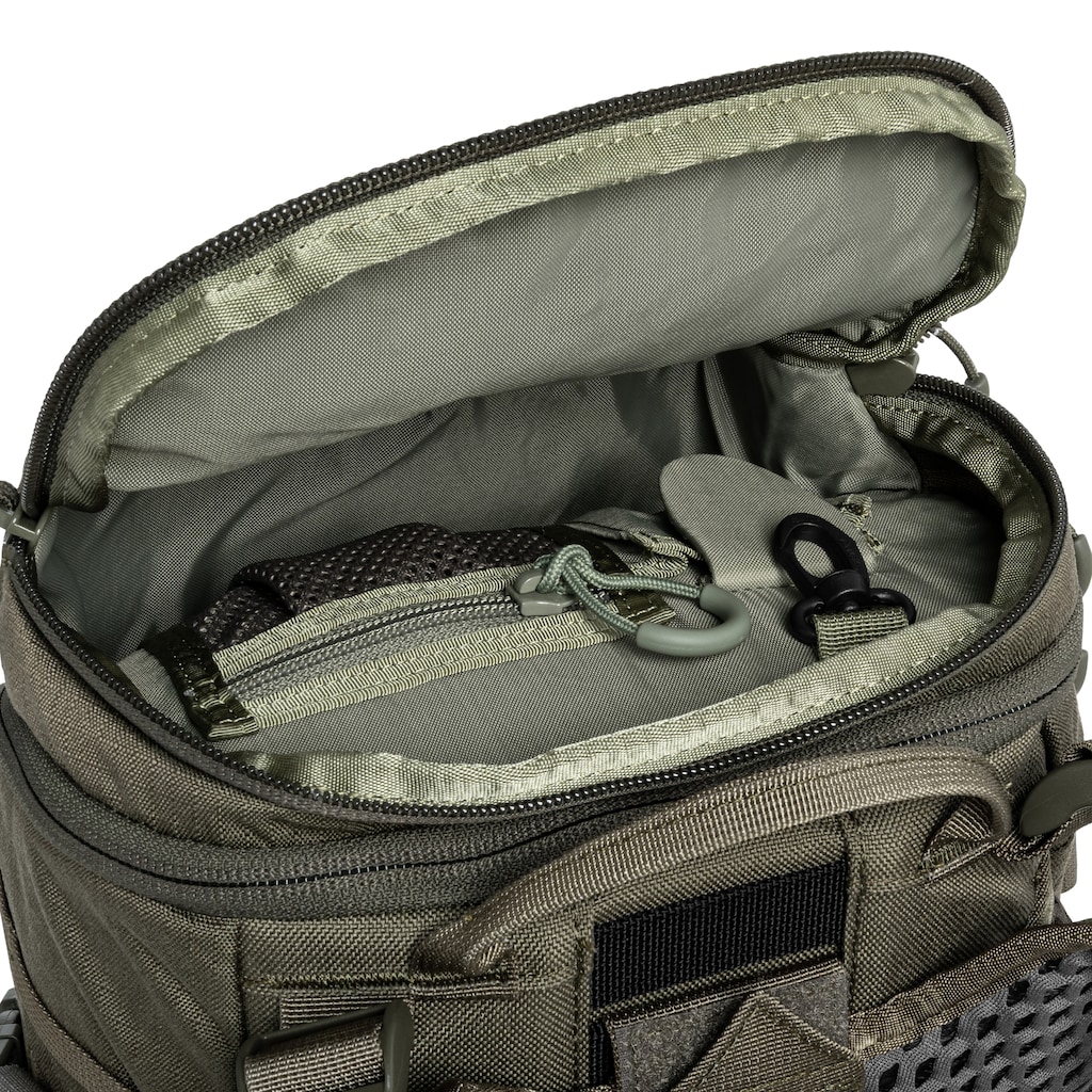 Regulowane pasy panelu frontowego pozwalają na stabilne przypięcie dodatkowego sprzętu z boku lub kompresję plecaka przy częściowym wypełnieniu. Komora główna rozpinana jest od góry do dołu, co umożliwia pełny dostęp do wnętrza. W górnej klapie umieszczono organizer z siatkową kieszenią na zamek oraz przegrodą na magazynki.