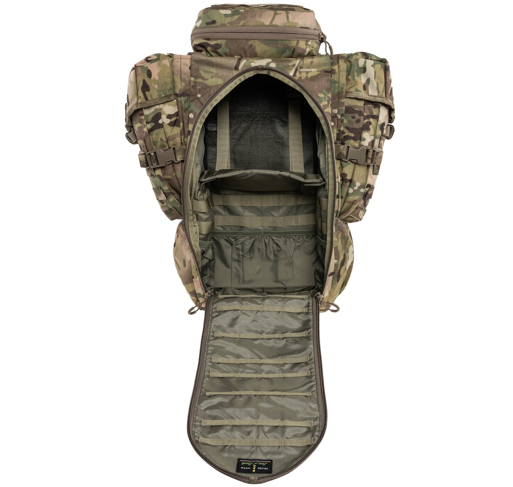 Komora główna plecaka wyposażona jest we frontowe otwarcie na zamek błyskawiczny, co ułatwia pakowanie i szybkie znalezienie potrzebnych rzeczy. Wewnątrz znajduje się składana półka organizacyjna, umożliwiająca podział przestrzeni na dwie niezależne sekcje – górną i dolną. Umieszczono tam również dwa rękawy na bukłaki hydracyjne, uchwyt na radiostację PRC-117 oraz liczne kieszenie wewnętrzne. Ściany komory wyposażono w taśmy MOLLE/PALS, pozwalające mocować dodatkowe kieszenie i akcesoria.