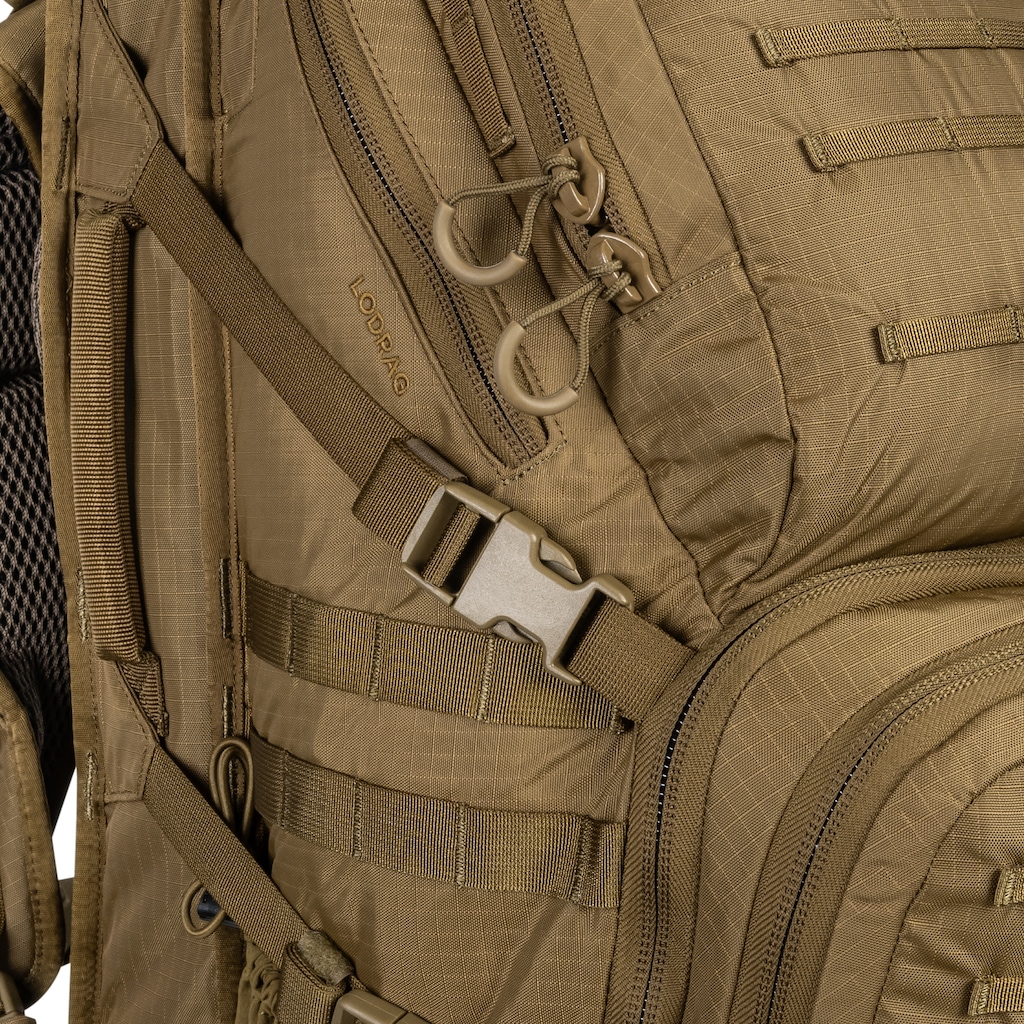 W modelu zastosowano liczne taśmy systemu MOLLE/PALS pozwalające na mocowanie dodatkowego sprzętu. Pasy kompresyjne z klamrami mogą służyć do zmniejszenia objętości plecaka lub montażu większej ilości ekwipunku. Znajdujący się na froncie prostokątny rzep pozwala na zamocowanie dowolnej naszywki lub emblematu np. flagi państwowej, godła jednostki albo tzw. Morale Patches.