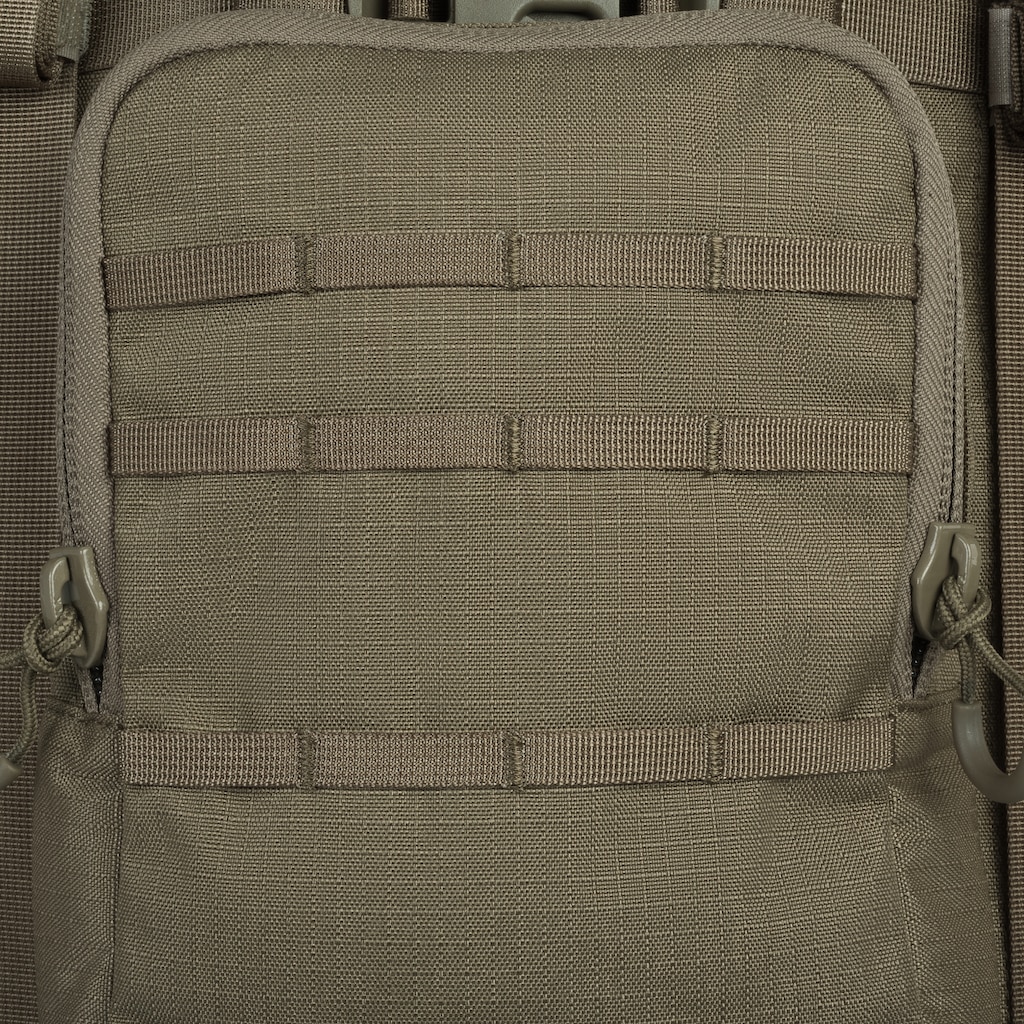 Równomierne rozłożenie ciężaru wspiera wzmocniona aluminiową ramą INTEX II, która odciąża ramiona i przenosi część obciążenia na biodra, zwiększając stabilność podczas marszu. Dodatkowe wsparcie zapewniają zdejmowany, regulowany pas biodrowy w systemie Tri-Glide oraz pas piersiowy, które utrzymują szelki w odpowiedniej pozycji i zapobiegają ich zsuwaniu się. Takie rozwiązanie poprawia balans plecaka i komfort poruszania się w terenie, szczególnie podczas dynamicznych działań lub na dłuższych trasach. Plecak wyposażono w pokrowiec przeciwdeszczowy.
