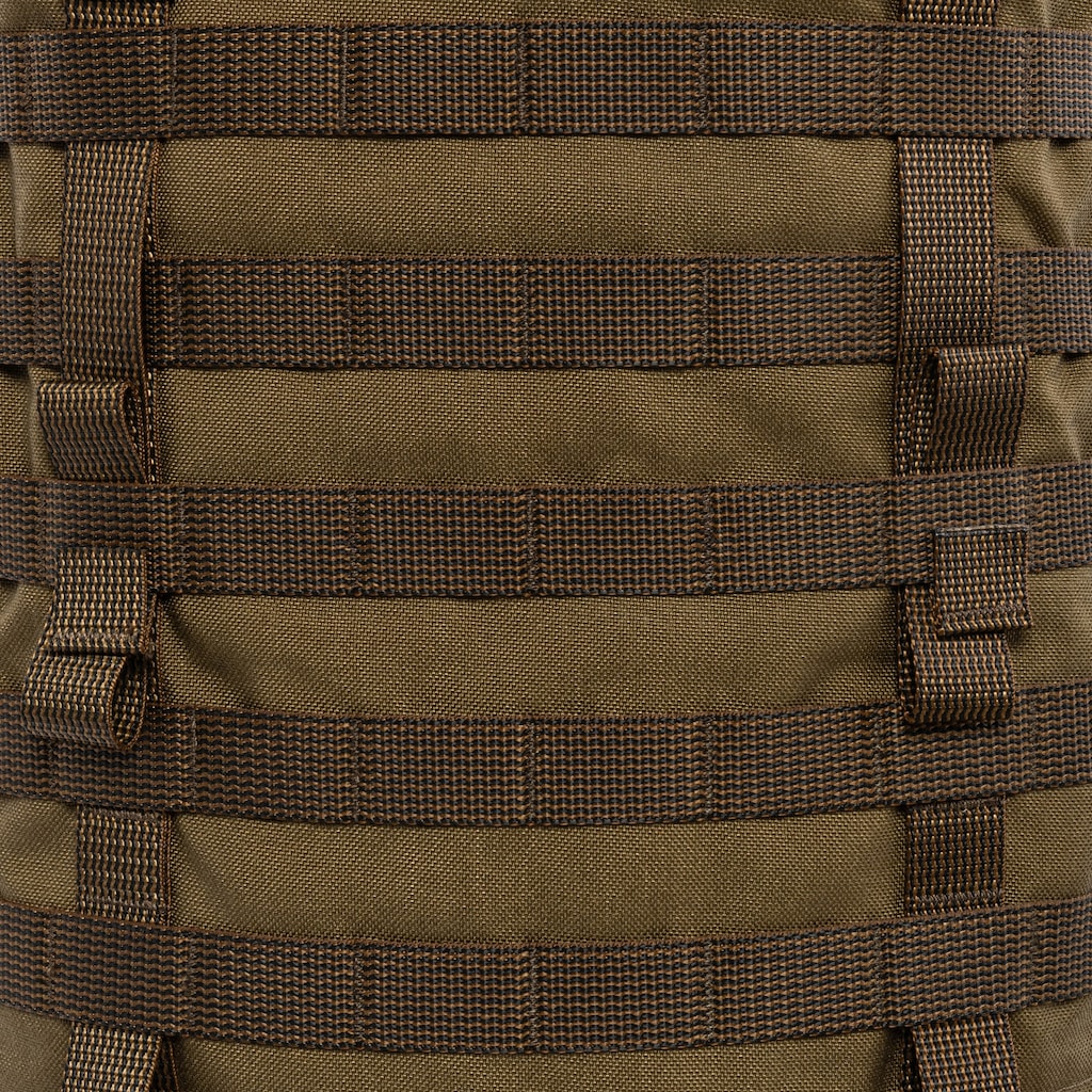 System MOLLE/PALS na bokach, klapie, pasie biodrowym oraz spodzie plecaka umożliwia dołączanie dodatkowych ładownic i sprzętu. Boczne paski kompresyjne pozwalają dopasować objętość plecaka do ładunku lub przymocować dodatkowy ekwipunek na zewnątrz.