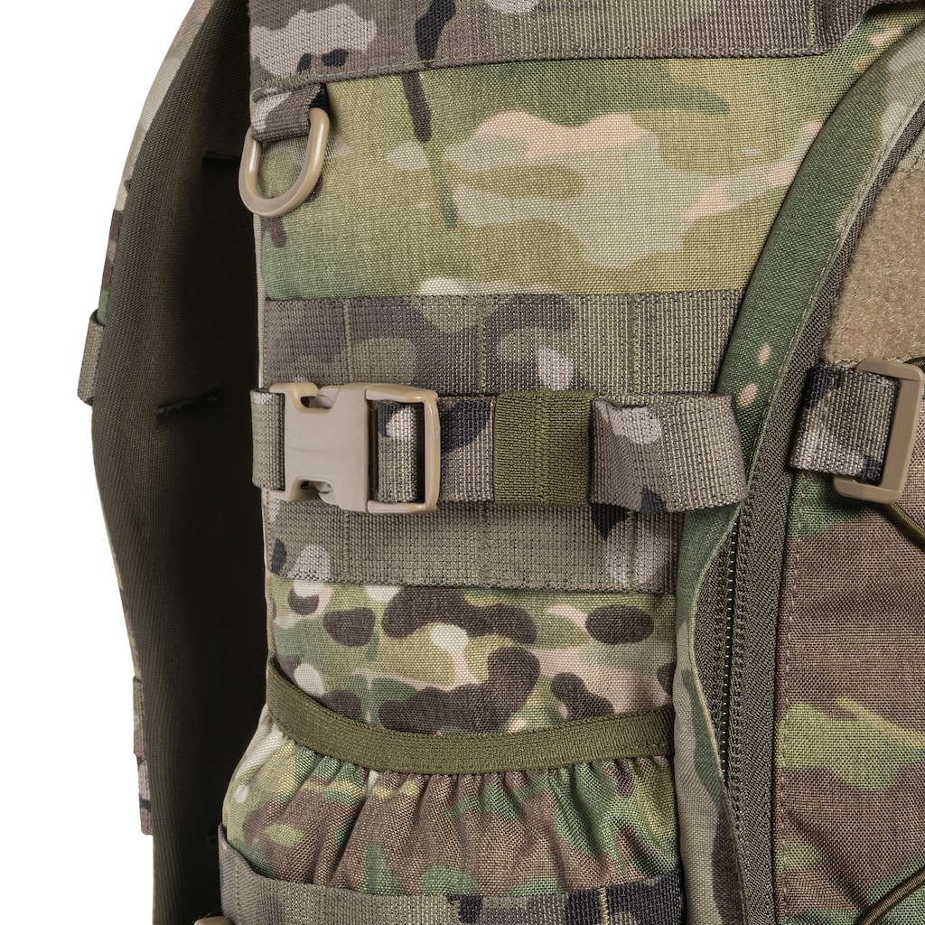Plecak o pojemności 30 litrów w kamuflażu MultiCam został wykonany z odpornej na uszkodzenia Cordury. Wyposażono go w wytrzymałe ryglowane szwy, zamki błyskawiczne Kroko oraz solidne klamry ITW Nexus i Duraflex. Model sprawdzi się zarówno podczas działań w terenie, jak i na weekendowych wycieczkach.