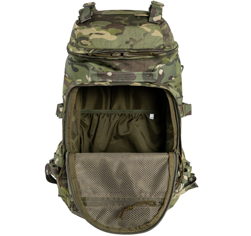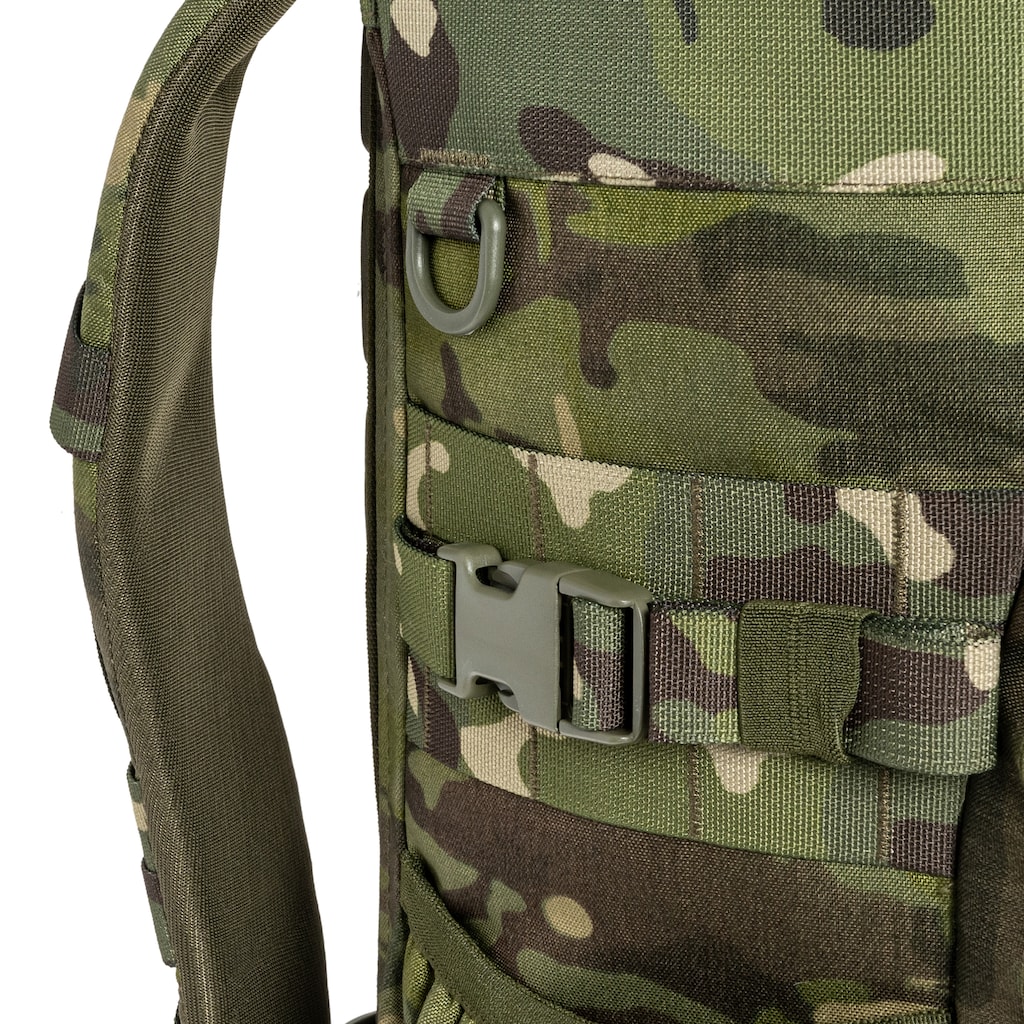 Plecak o pojemności 30 litrów w kamuflażu MultiCam Tropic został wykonany z odpornej na uszkodzenia Cordury. Wyposażono go w wytrzymałe ryglowane szwy, zamki błyskawiczne Kroko oraz solidne klamry ITW Nexus i Duraflex. Model sprawdzi się zarówno podczas działań w terenie, jak i na weekendowych wycieczkach.