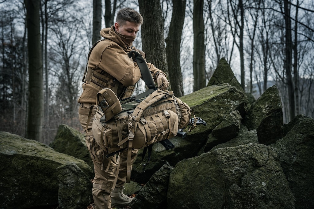 Plecak wyposażono w system MOLLE/PALS, który umożliwia zamocowanie dodatkowych kieszeni i akcesoriów. Dużą swobodę konfiguracji zapewniają również zewnętrzne troki zapinane klamrami, które nadadzą się do przenoszenia takich przedmiotów, jak karimata lub śpiwór.