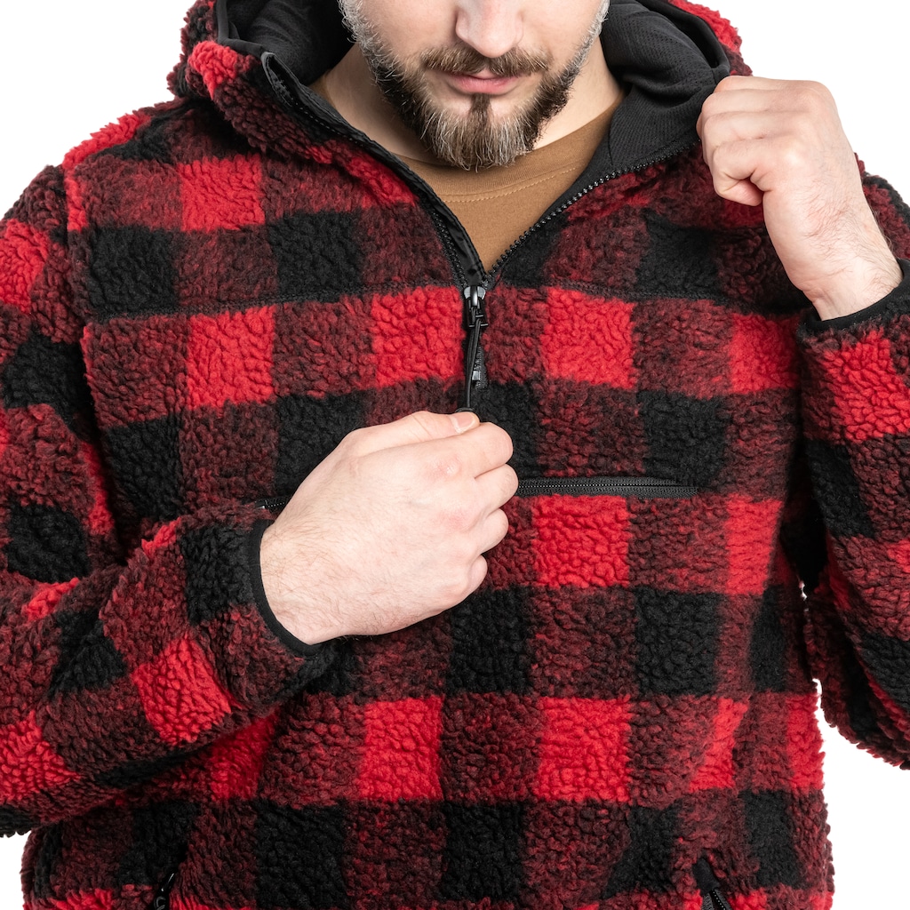 Ciepła, częściowo rozpinana bluza polarowa w kolorze Red/Black, wykonana z grubego pluszowego materiału z oddychającą podszewką. Zastosowany materiał zapewnia wysoką izolację termiczną, a luźny krój umożliwia założenie dodatkowych warstw odzieży, w zależności od panujących warunków atmosferycznych.