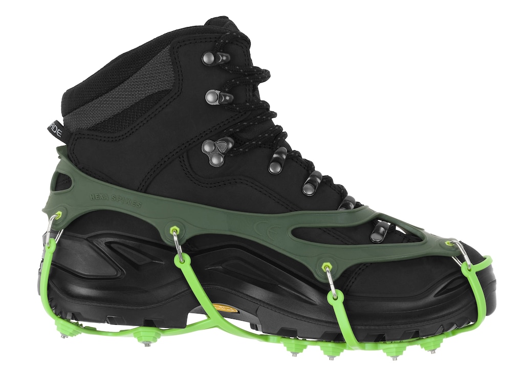 Raczki w kolorze oliwkowym, zaprojektowane z myślą o użytku miejskim oraz do biegania w mniej wymagającym terenie. Zapewniają przyczepność na lodzie, zamrożonym śniegu, a także na błotnistych szlakach w cieplejszych porach roku. Dzięki elastycznej konstrukcji raczki dopasowują się do buta i nie powodują dyskomfortu nawet przy bieganiu. Nie stanowią zamiennika dla klasycznych raków i nie nadają się do wspinaczki ani wyjść w wysokie partie gór.