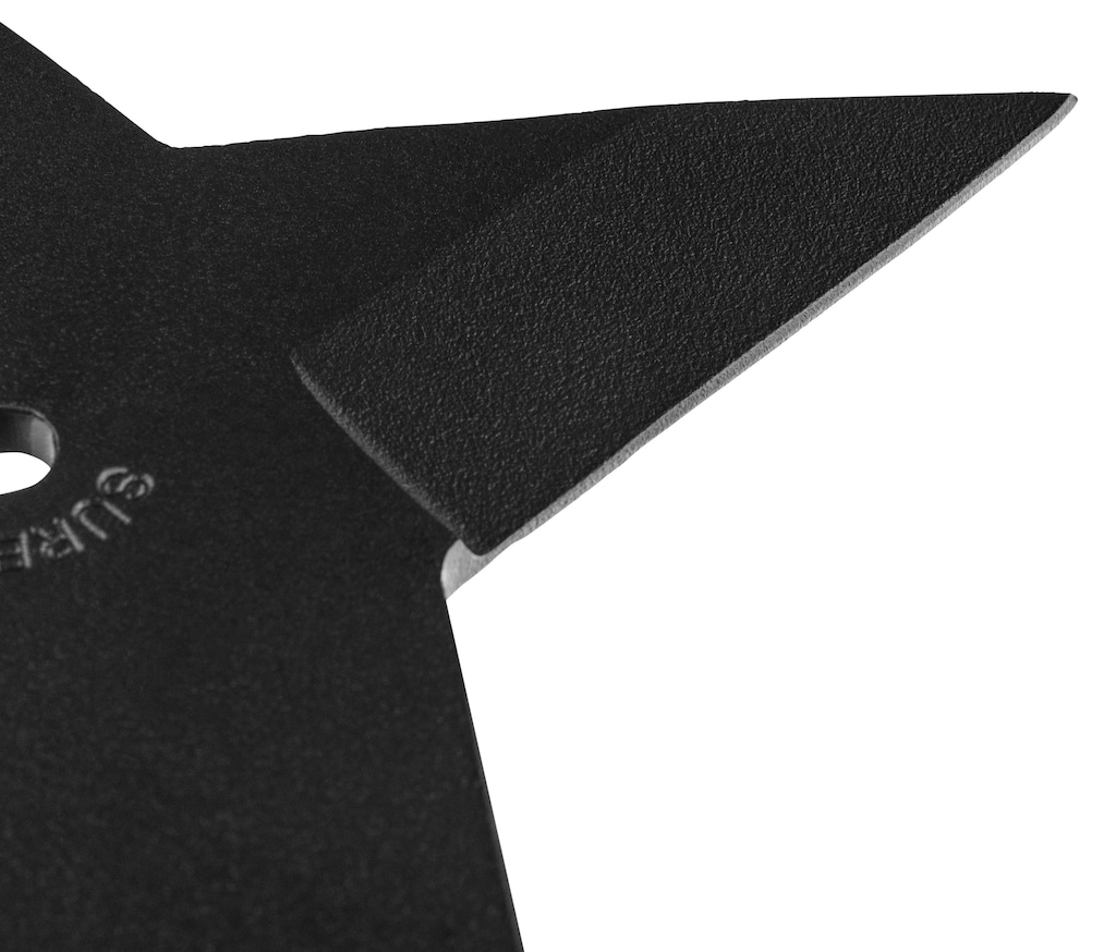 Czteroramienne rzutki z otworem w środku wykonano z wysokowęglowej stali 1055, ciętej laserowo i poddanej obróbce termicznej w celu uzyskania sprężystego hartowania. Krawędzie na każdym z ramion wyprowadzono szlifem płaskim. Całość wykończono czarną powłoką epoksydową, która zabezpiecza przed korozją i zarysowaniami.