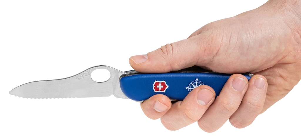 Duże, częściowo ząbkowane ostrze otwiera się za pomocą otworu pod kciuk i nadaje się do cięcia lin, sieci oraz innych materiałów włóknistych. Blokowany rożek szkutniczy ułatwia rozplątywanie węzłów i obsługę szekli.