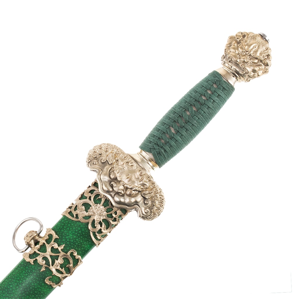 Rękojeść została opleciona zielonym sznurem. Jelec oraz głowica umieszczona na końcu rękojeści przedstawiające lwa, wykonane zostały ze stopu srebra i niklu.