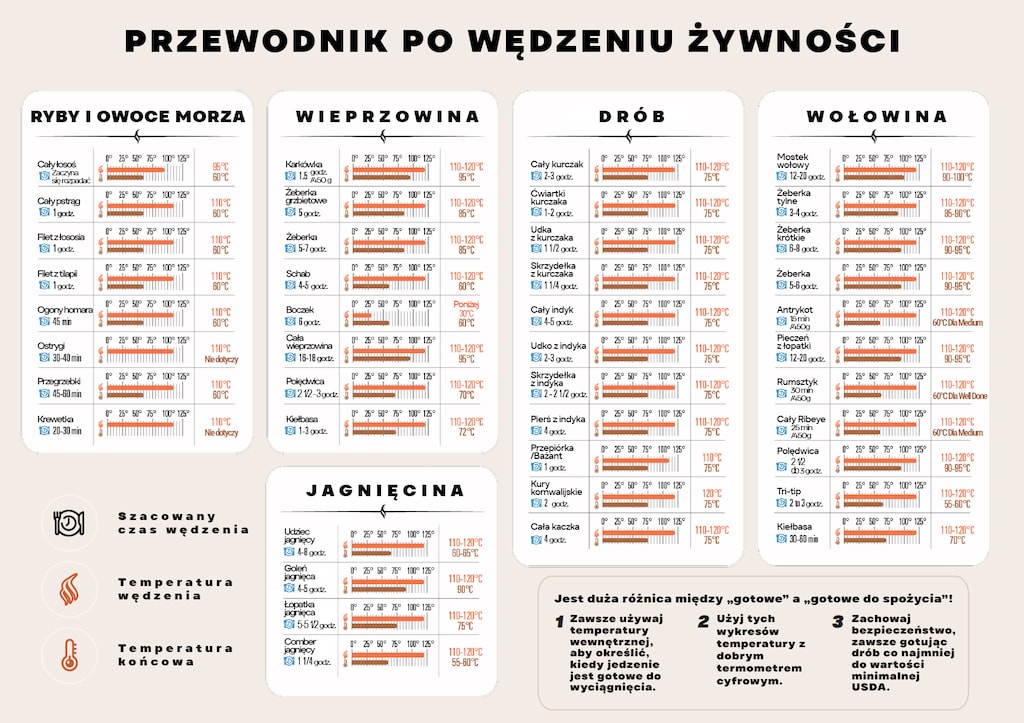 Antypoślizgowe elementy umieszczone na podstawie poprawiają stabilność podczas pracy na różnych powierzchniach, ograniczając ryzyko przesuwania się wędzarni w trakcie użytkowania. Model może pracować w temperaturach zewnętrznych od -10 do +50 stopni Celsjusza.