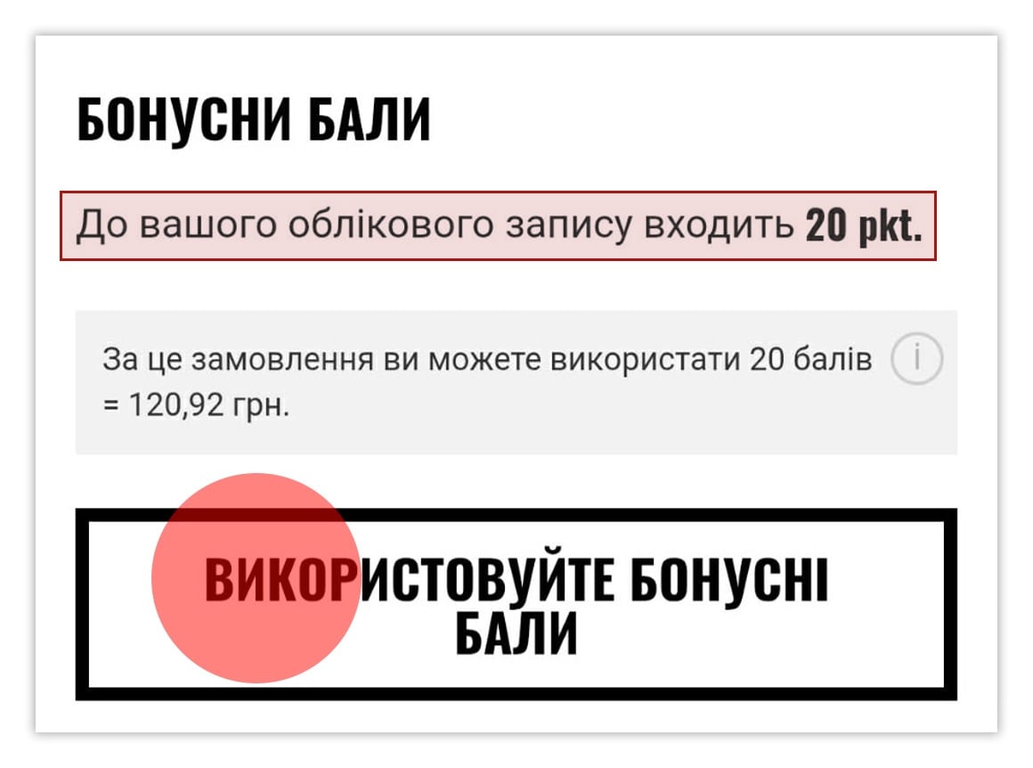 - Ви зробите покупку (кількість балів за товар відображається на сторінці товару)