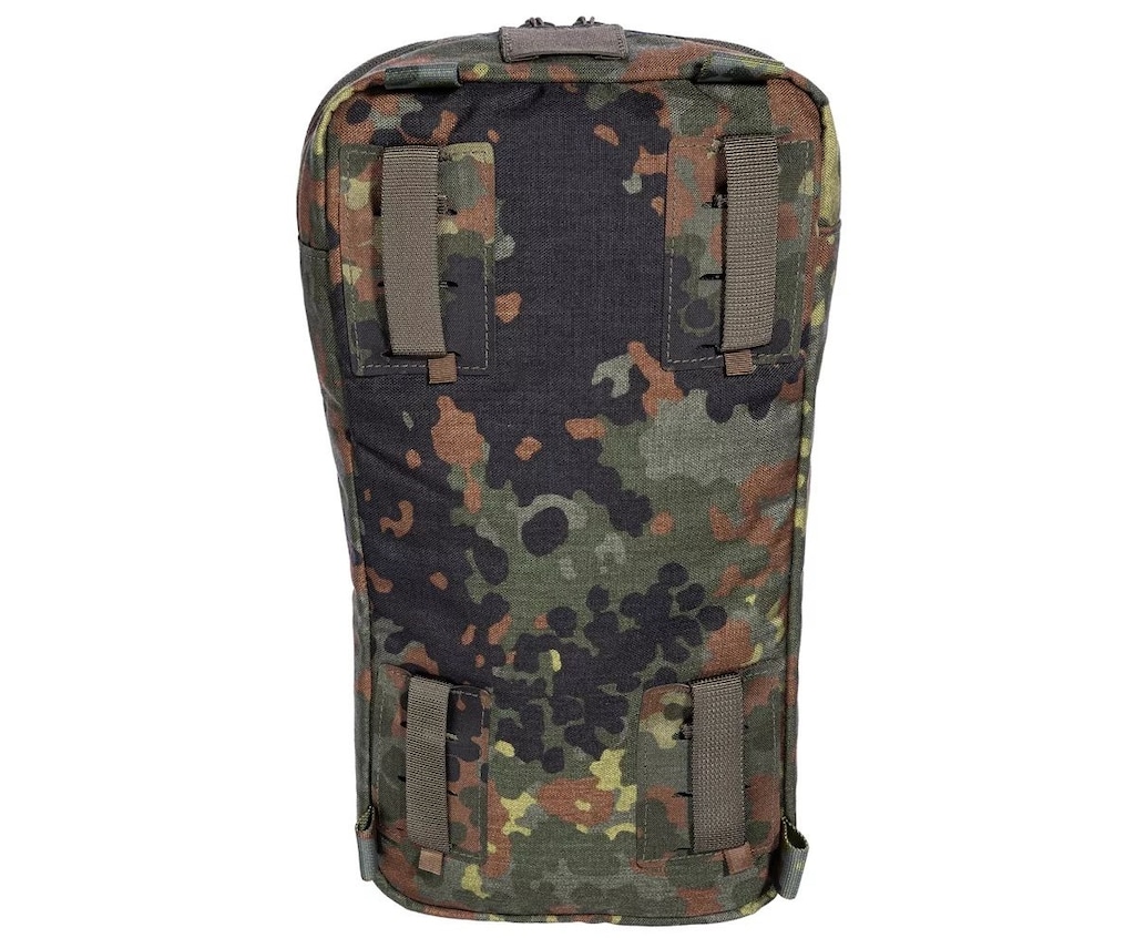 Чохол для гідратора у камуфляжі Flecktarn місткістю до 2 літрів, виготовлений з міцного матеріалу Cordura. Оснащений системою кріплення MOLLE/PALS, що дозволяє кріпити його до тактичних жилетів і рюкзаків. Всередині знаходиться петля, що стабілізує гідратор, не даючи йому зміщуватися. Конструкцію доповнюють перевернута блискавка, дренажний отвір та чотири зовнішні петлі, що дозволяють приєднати систему кріплення, яка перетворює чохол на рюкзак.