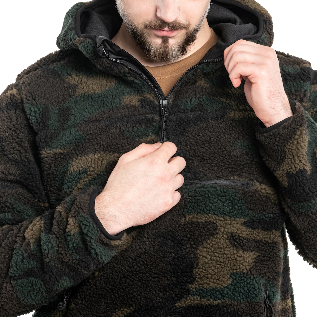 Тепла, частково розстібнена флісова кофта кольору Woodland, виготовлена з товстого плюшевого матеріалу з дихаючою підкладкою. Використаний матеріал забезпечує високу теплоізоляцію, а вільний крій дозволяє носити додаткові шари одягу, залежно від погодних умов.