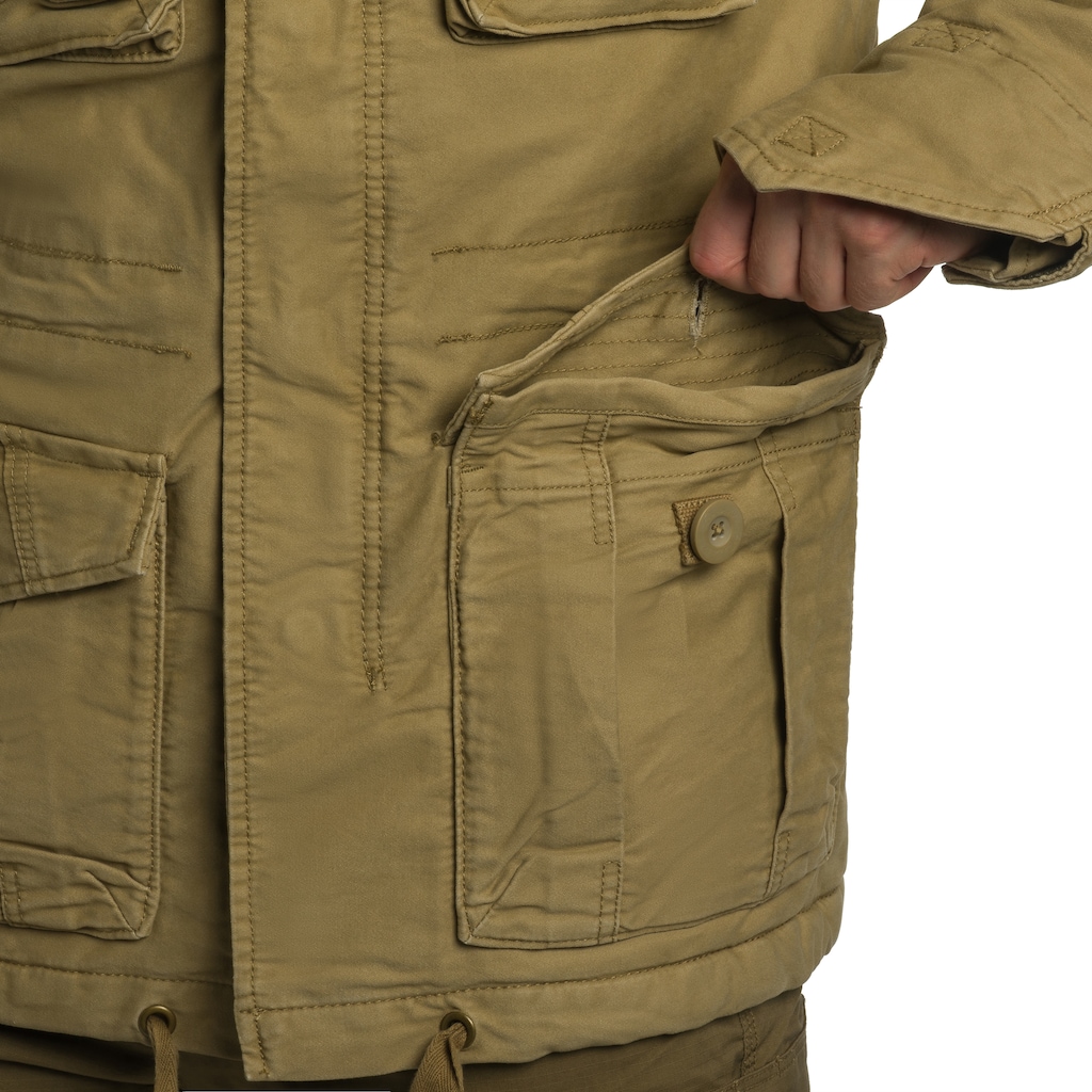 Куртка у кольорі Coyote з прямим, злегка подовженим кроєм, що відрізняється військово-повсякденним стилем. Верхня частина виготовлена з міцної та повітропроникної бавовняної тканини. Використаний матеріал робить куртку вітрозахисною, а також забезпечує циркуляцію повітря.