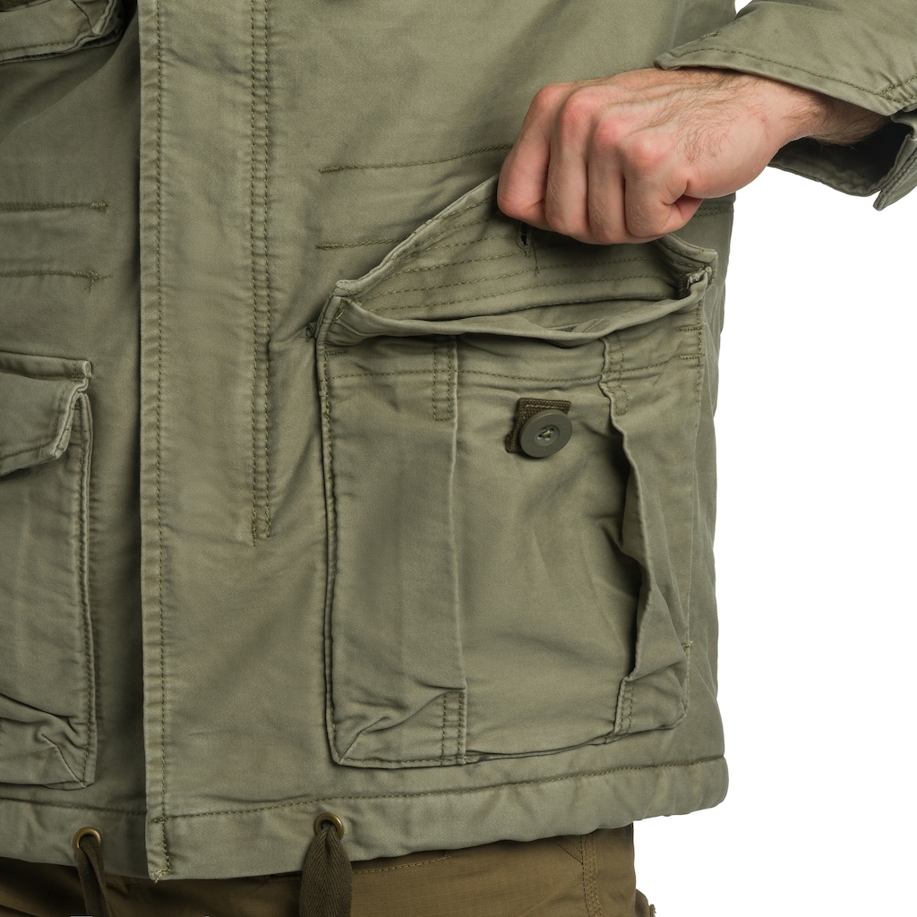 Куртка оливкового кольору з прямим, злегка подовженим кроєм, що відрізняється військово-повсякденним стилем. Верхня частина виготовлена з міцної та повітропроникної бавовняної тканини. Використаний матеріал робить куртку вітрозахисною, а також забезпечує циркуляцію повітря.