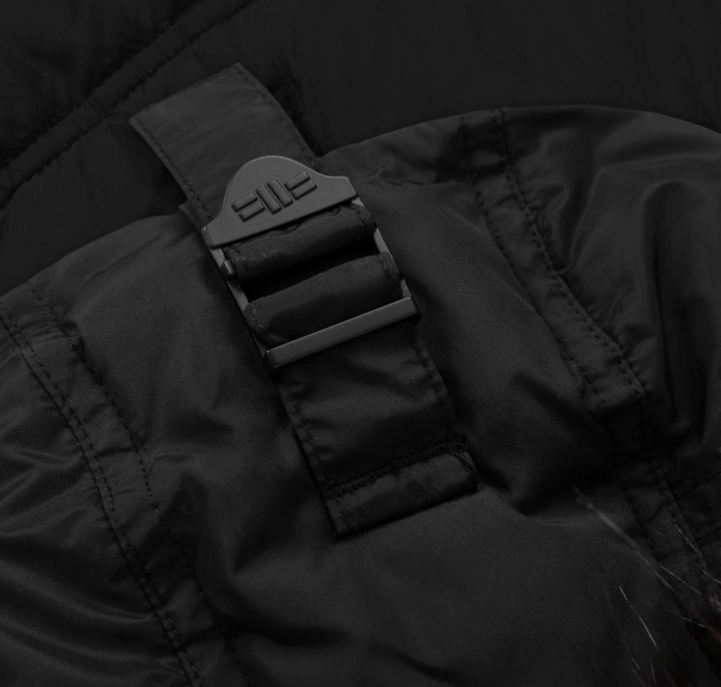 Куртка застібається на двосторонню блискавку, яка захищена штормовим клапаном, що застібається на великі ґудзики. Таке рішення забезпечує краще збереження температури та захищає від проникнення сильного вітру. Глибокий капюшон, закінчений високим коміром-стійкою, обшитий синтетичним знімним хутром і оснащений стягувачами та пряжкою для регулювання.