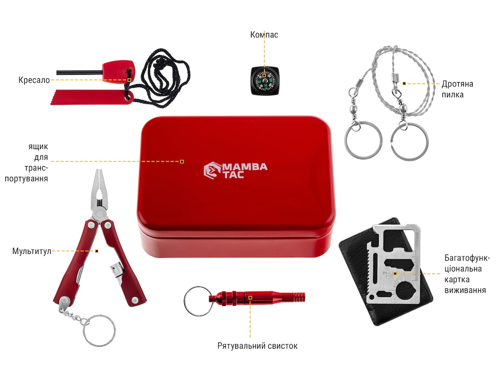 Ще один набір для виживання від mamba tac, керуючись принципом «краще щось, ніж нічого», рекомендую покласти цей комплект на дно рюкзака або до бардачка автомобіля — він не займає багато місця та коштує недорого, а може стати в пригоді в багатьох ситуаціях. Звісно, рекомендую поступово доповнювати необхідними для вас елементами.
