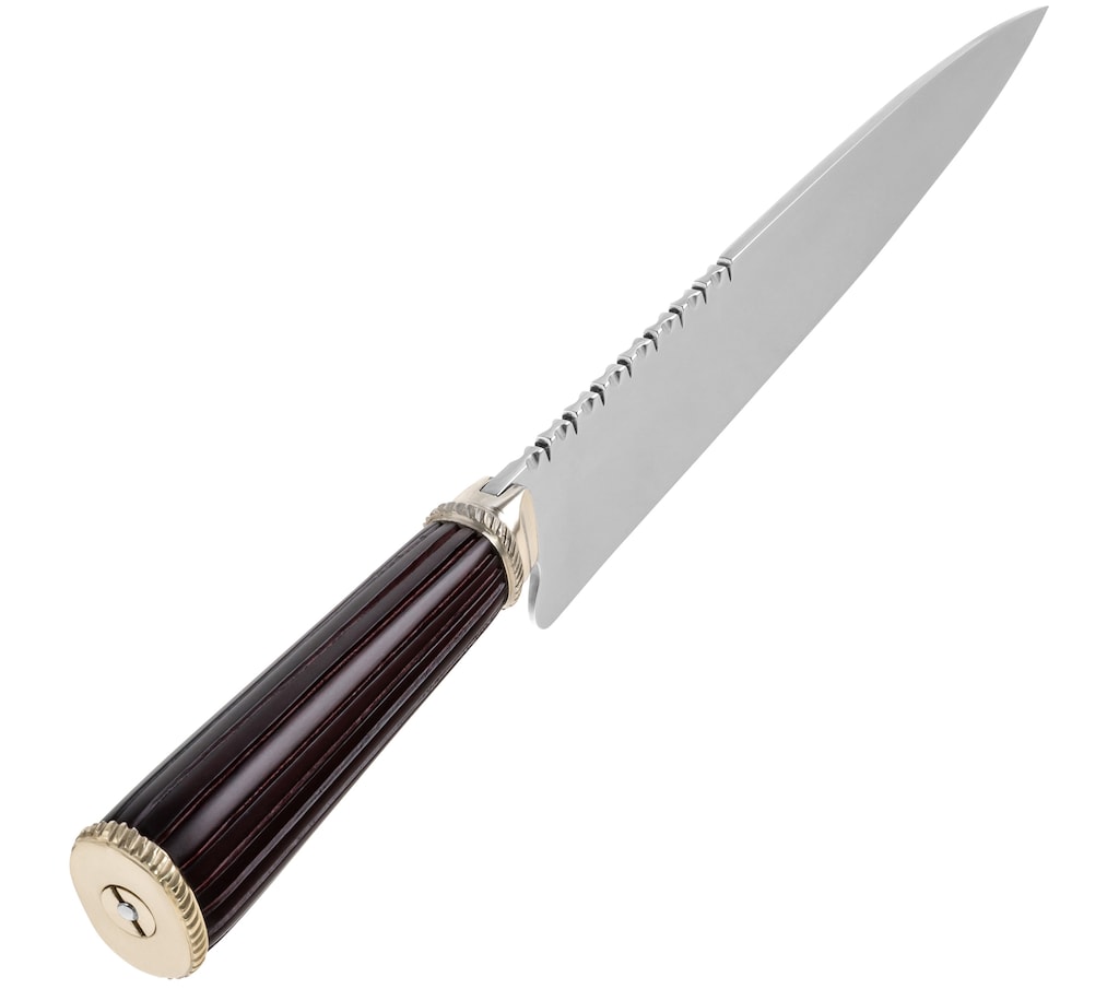 Неймовірний ніж, я тестував його на кухні і він супер. Звісно, він товстий, і тонкі кухонні ножі мають перевагу, але сталь тут свою справу робить — все ж вуглецева сталь це вуглецева сталь. І вага ножа справляє враження.