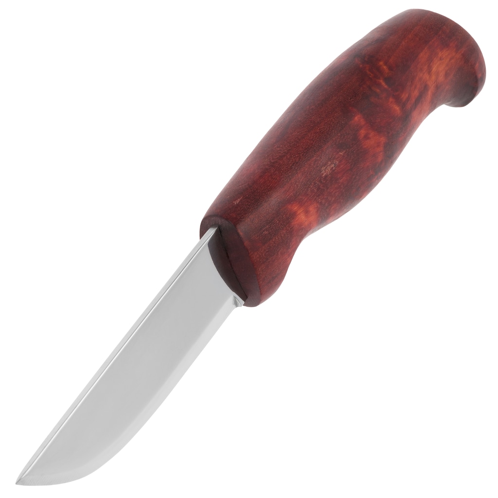 Ніж загальною довжиною 203 мм із клинком довжиною 90 мм та профілем Drop-Point, виготовленим із нержавіючої сталі 12C27. Лезо оброблено шліфуванням scandi (скандинавським). Клинок оброблено методом сатинування, що надає йому матового ефекту. Облицювання рукоятки виконано з пофарбованої в червоно-чорний колір деревини крученої берези