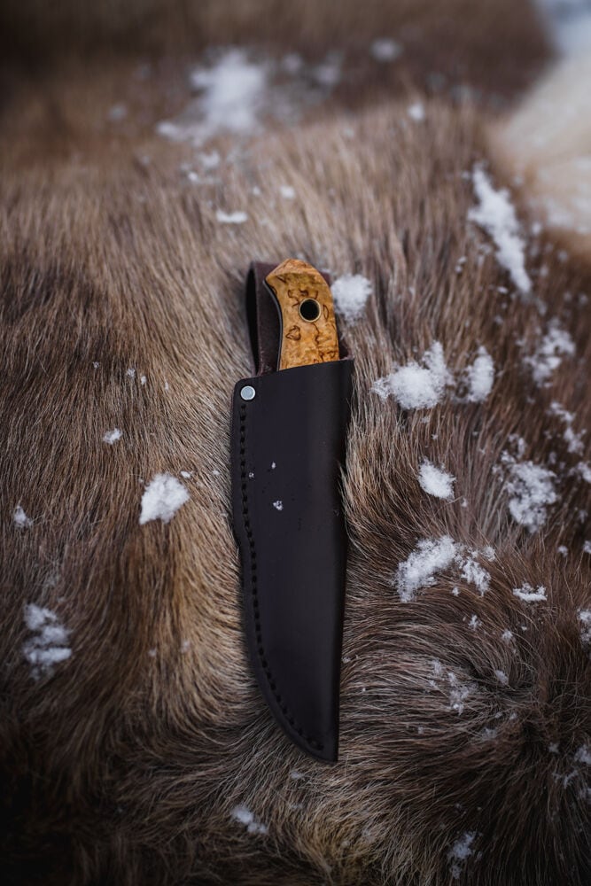 Ергономічно сформовану рукоятку виготовлено з карельської берези, покрито лаком та закріплено за допомогою латунних заклепок. Від зісковзування руки на лезо захищає спеціально профільована нижня частина хвату. Сама рукоятка закінчується обкованим отвором для протягування шнурка, що запобігає втраті.