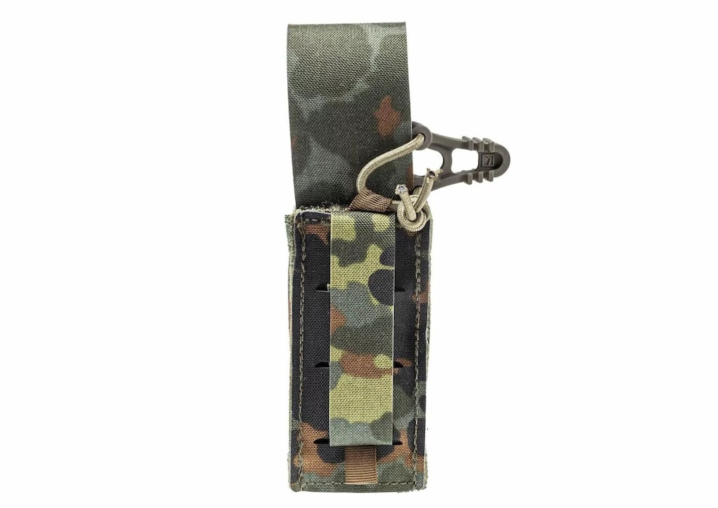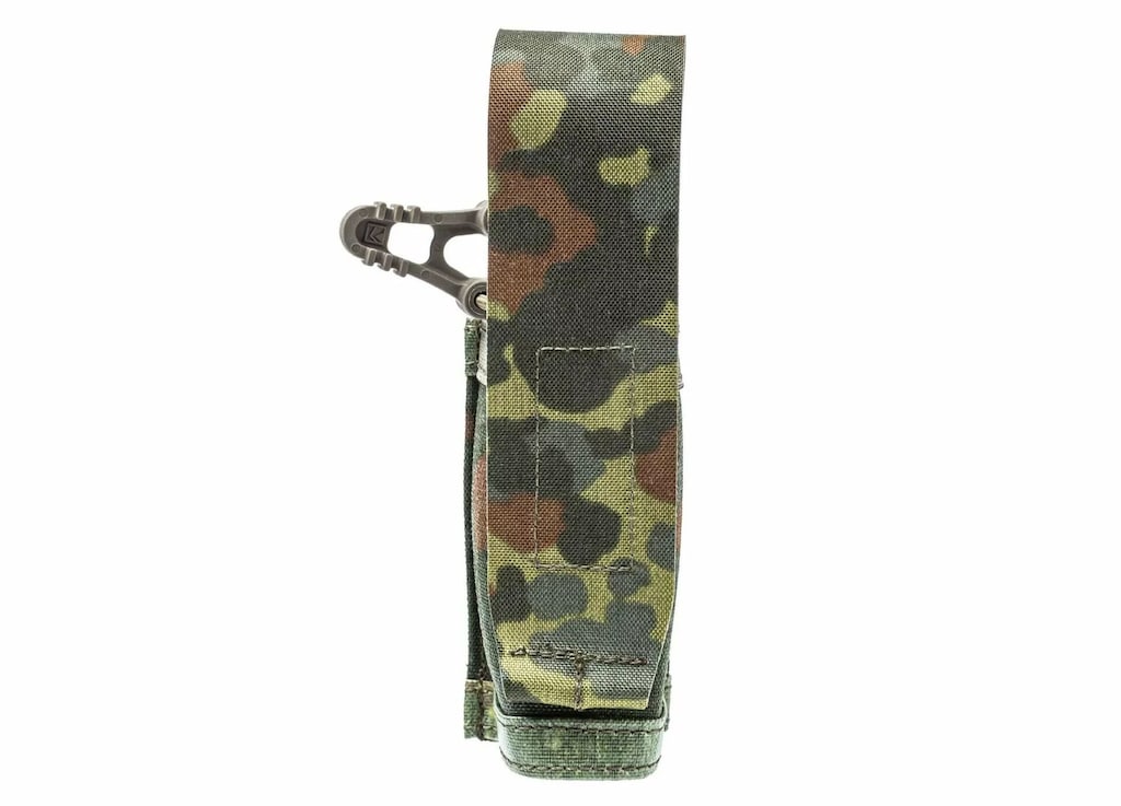 Компактний підсумок у камуфляжі Flecktarn на один дворядний пістолетний магазин калібру 9 мм, виготовлений з легкого ламінату MX. Оснащений еластичною мотузкою (shock cord) з фіксатором Alpha Tab, що дозволяє швидко закріпити магазин, а також системою кріплення MOLLE/PALS для прикріплення на жилеті або тактичному поясі. Підійде також для перенесення ліхтарика, мультитула або інших аксесуарів схожих розмірів.